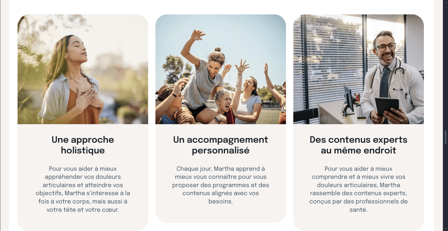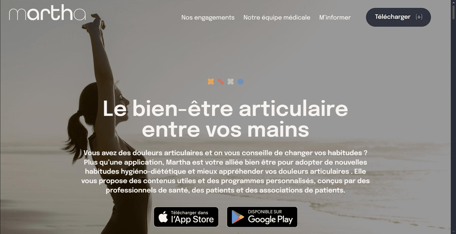 Martha est une application mobile gratuite lancée par les Laboratoires Expanscience. Elle vise à accompagner les personnes souffrant de douleurs ou de pathologies articulaires chroniques, notamment l’arthrose, à travers des approches non médicamenteuses basées sur l’hygiène de vie. Elle s’inscrit dans la continuité de l’engagement d’Expanscience dans le domaine de la santé articulaire et du partenariat avec l’association AFLAR.
