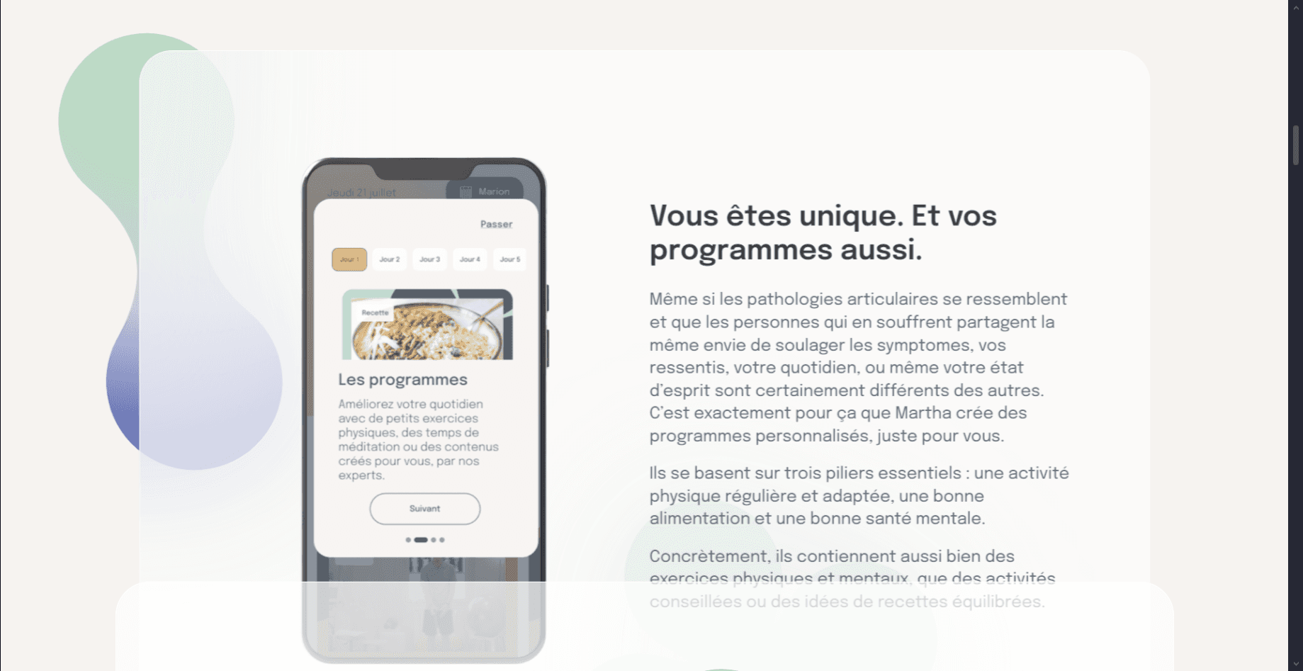 L’application propose une personnalisation des parcours en fonction du profil et des douleurs de l’utilisateur. Trois grands axes sont abordés : activité physique adaptée (exercices, étirements, yoga, mobilité), nutrition (recettes, conseils alimentaires), et bien‑être mental (relaxation, sophrologie, méditation).